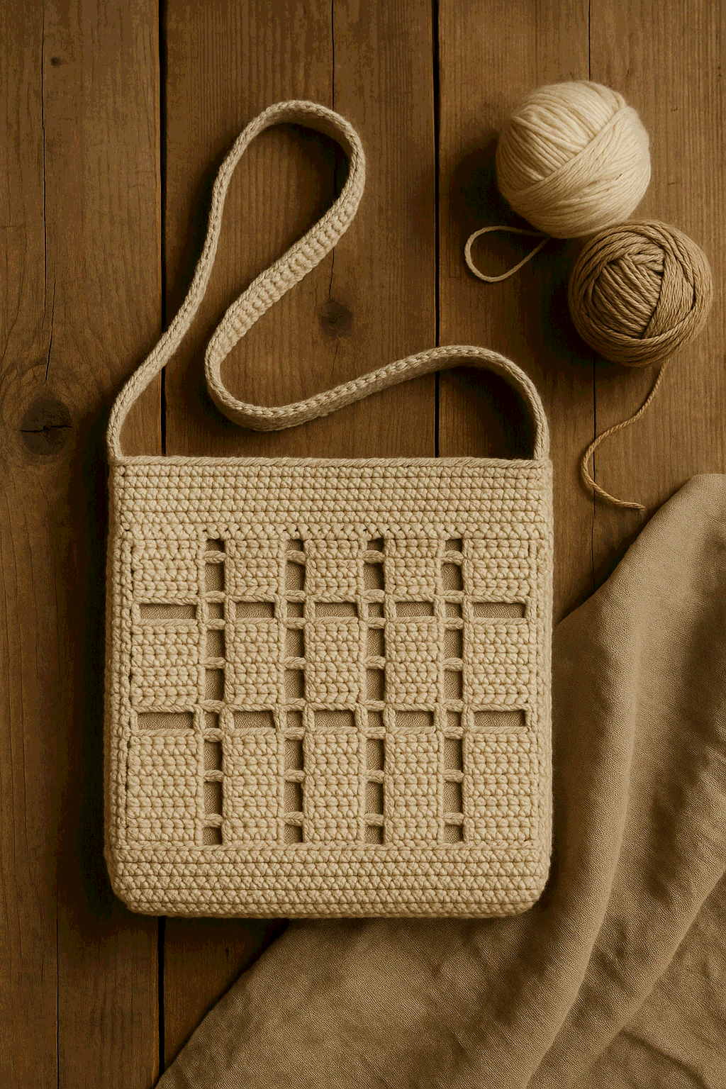 Небольшая вязаная сумочка с длинным ремешком — лёгкая, как утренний луч. Мягкий бежевый цвет и аккуратный узор из квадратов создают ощущение тишины и света. Идеальна для самых нужных мелочей, которые хочется держать ближе к сердцу.